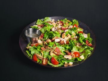 Mix verde, salmon a la miel, almendras tostadas, aceitunas verde y tomate cherry