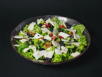 Mix verde, queso de cabra, tomate cherry, pepino, oregano y aceitunas negras.